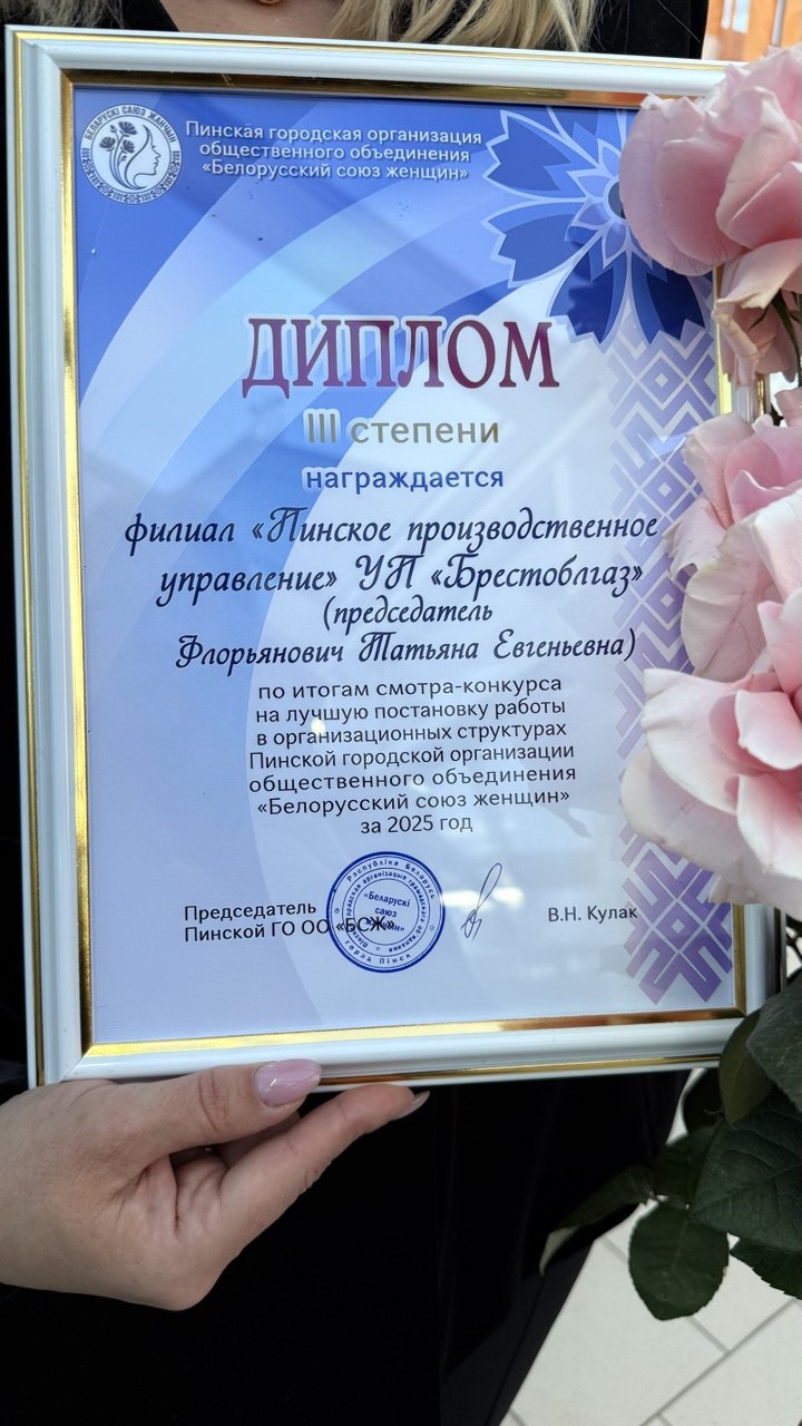 Первичная организация Белорусского союза женщин ПУ «Пинскгаз» заняла 3-е место среди 113 организаций Пинской городской организации ОО «БСЖ» за 2025 год!